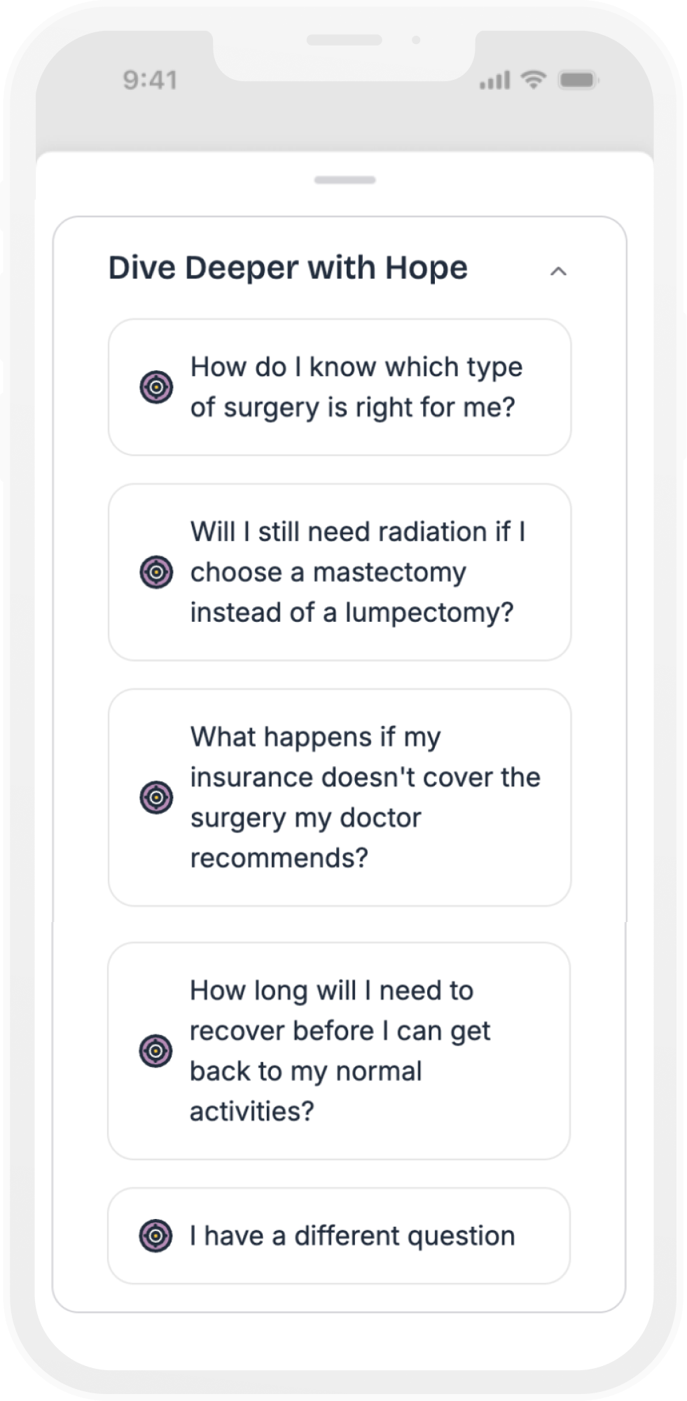 Each station on the map has a powerful combination of insights from our clinical team members, alongside Hope, our AI partner, to help you get the answers you need.